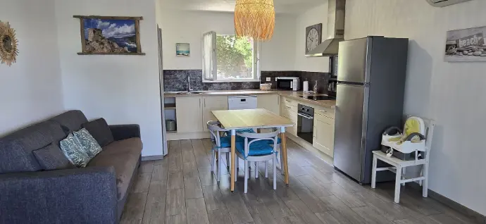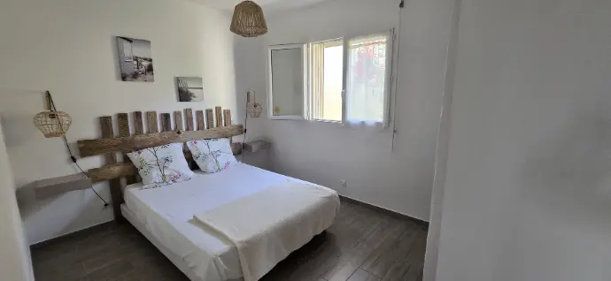 Les maisons sont composées de 2 chambres lit double, d'une pièce de vie avec cuisine ouverte et un canapé lit dans le salon, climatisation, lave vaisselle, lave linge, wifi, barbecue, une belle terrasse. La capacité d'accueil est de 6 personnes.